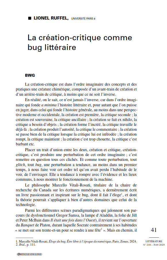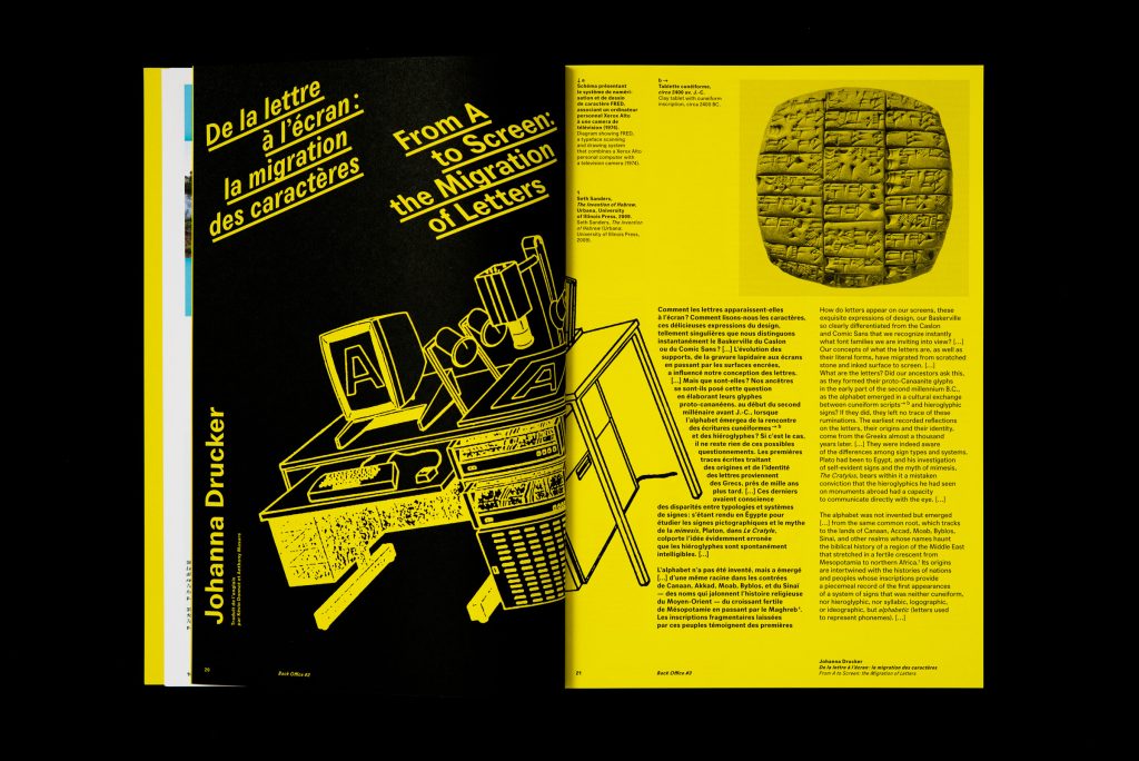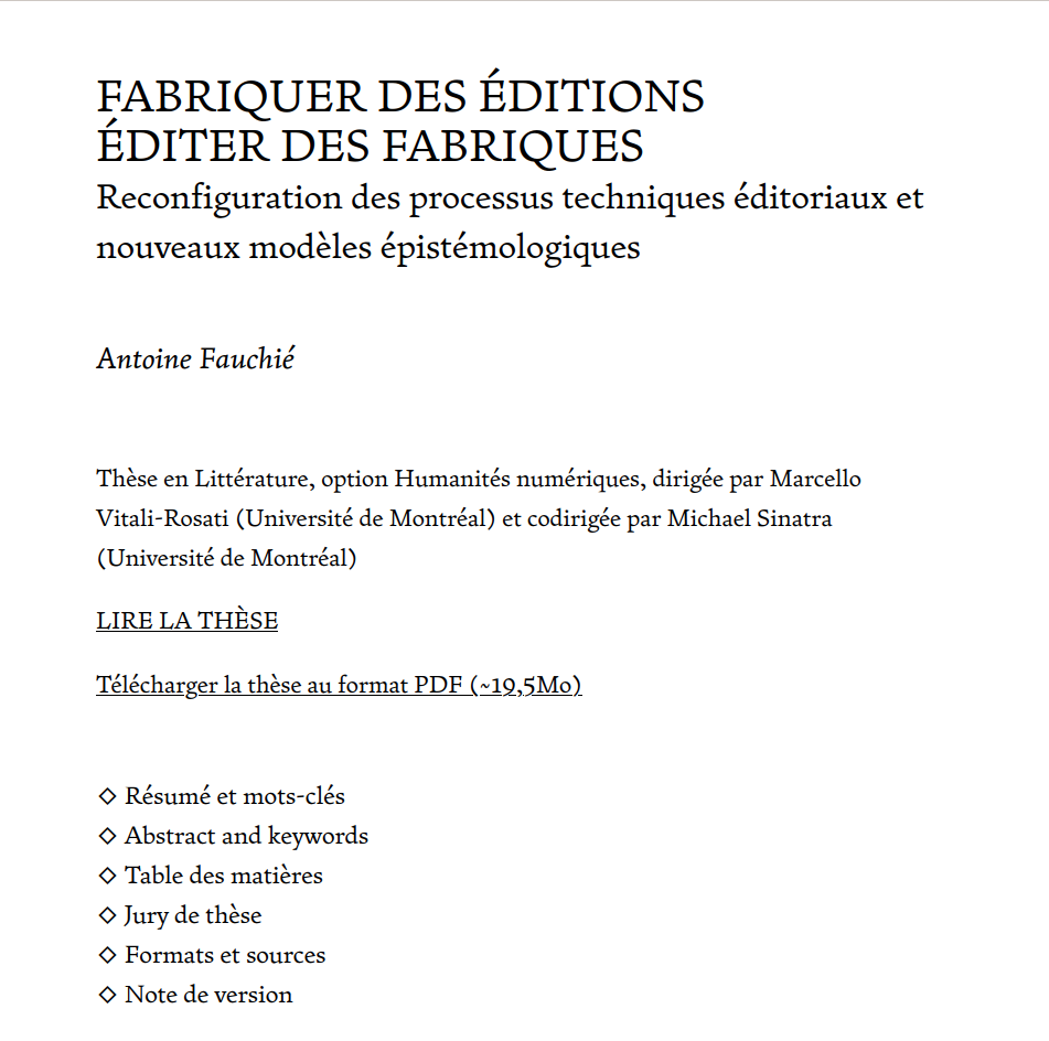 « La fabrique d’édition est un phénomène, il sʼagit de l’imbrication et de la réflexivité du travail sur le texte et de la constitution d’un processus technique permettant ce travail. Le choix, l’gencement voir le développement des outils d’éition sont réalisés en même temps que le texte est sélectionné, structuré, corrigé, mis en forme et publié. Il ne s’agit pas de deux calques qui se superposent mais d’un entremêlement de micro-actions qui donnent lieu à l’acte éditorial. La forme de l’artefact éditorial est façonné par le processus technique, et ce dernier est mis en place en fonction du projet d’édition. »