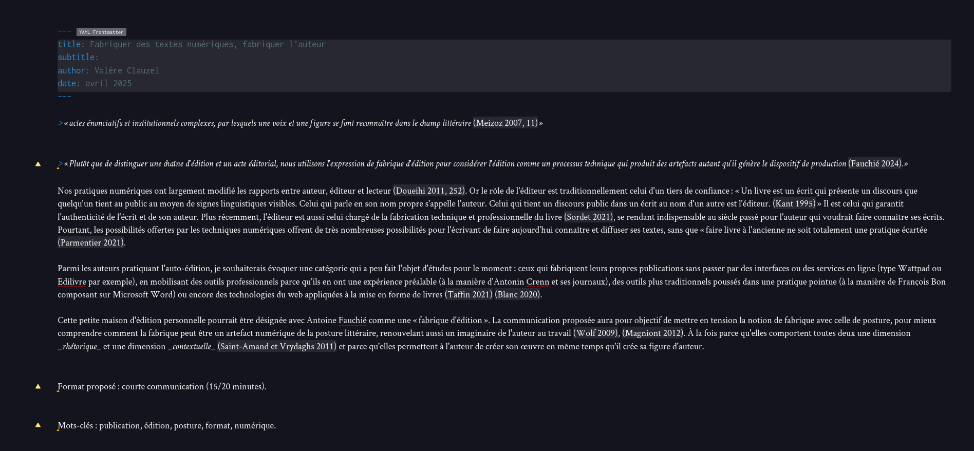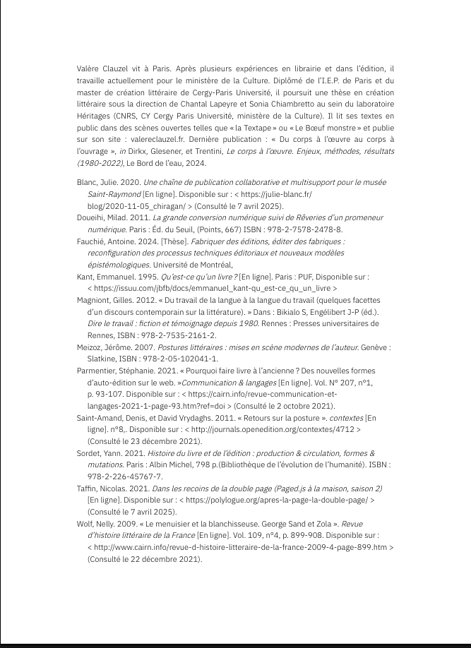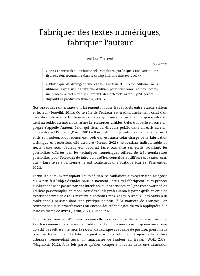 « Plutôt que de distinguer une chaîne d’édition et un acte éditorial, nous utilisons l’expression de fabrique d’édition pour considérer l’édition comme un processus technique qui produit des artefacts autant qu’il génère le dispositif de production (Fauchié, 2024). »
